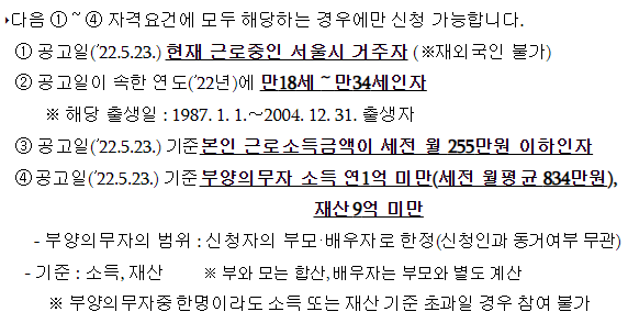 • 2022년 공고일(22.05.23.) 기준 본인 근로소득 세전 월 255만 원 이하